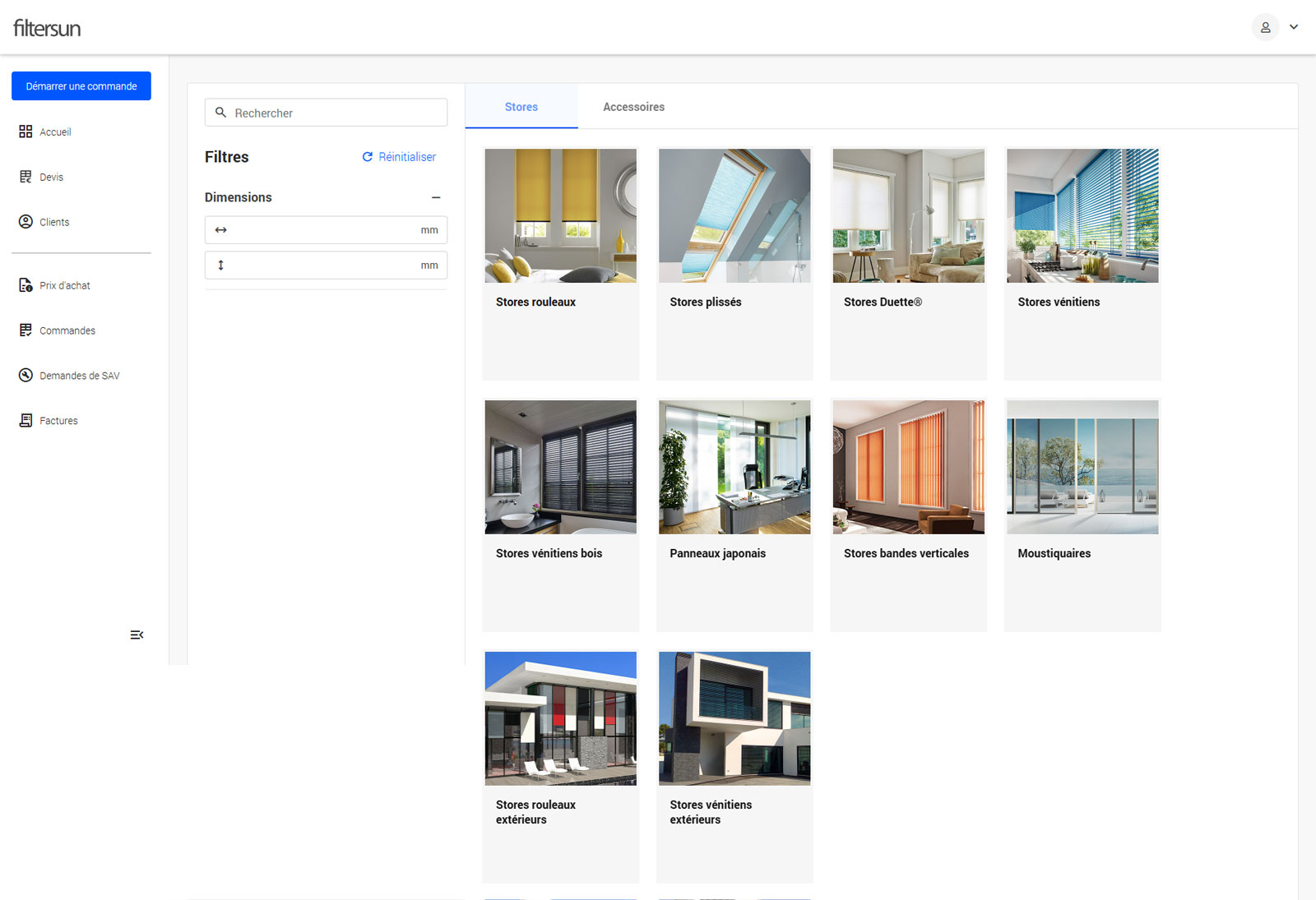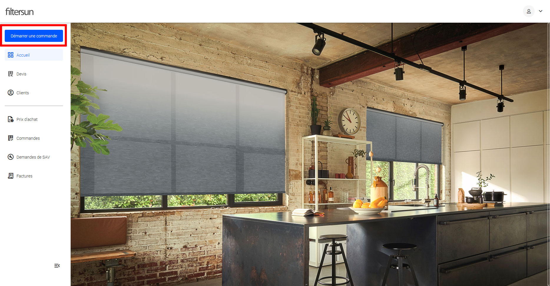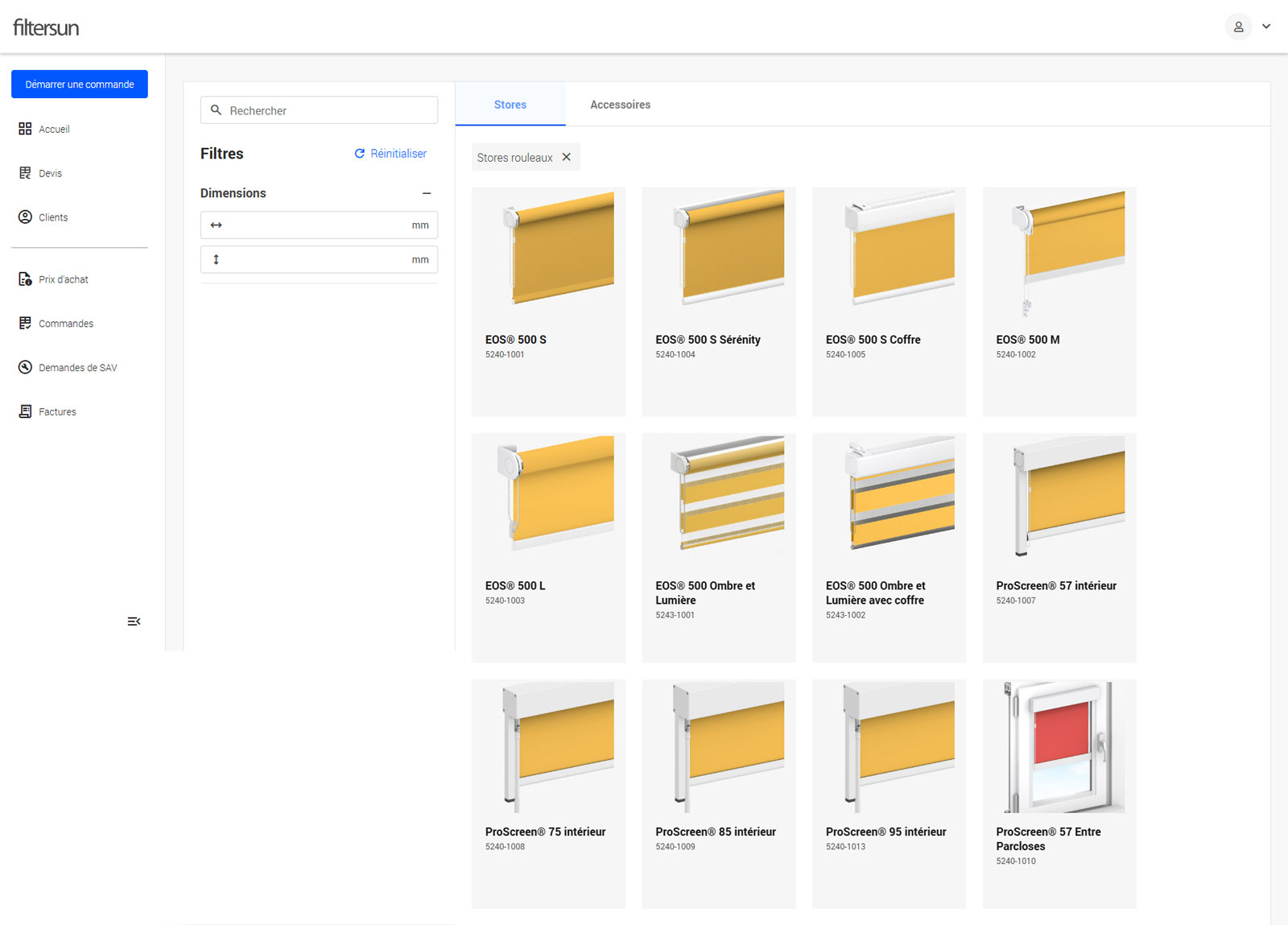 Pour créer un devis, cliquez sur le bouton "Démarrer une commande" pour sélectionner un produit à configurer :