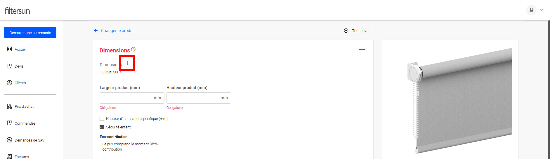 Pour la majorité des produits, un bouton d'information est présent en haut à droite de la première étape. Il permet d'afficher des informations sur la prise de mesure du produit :