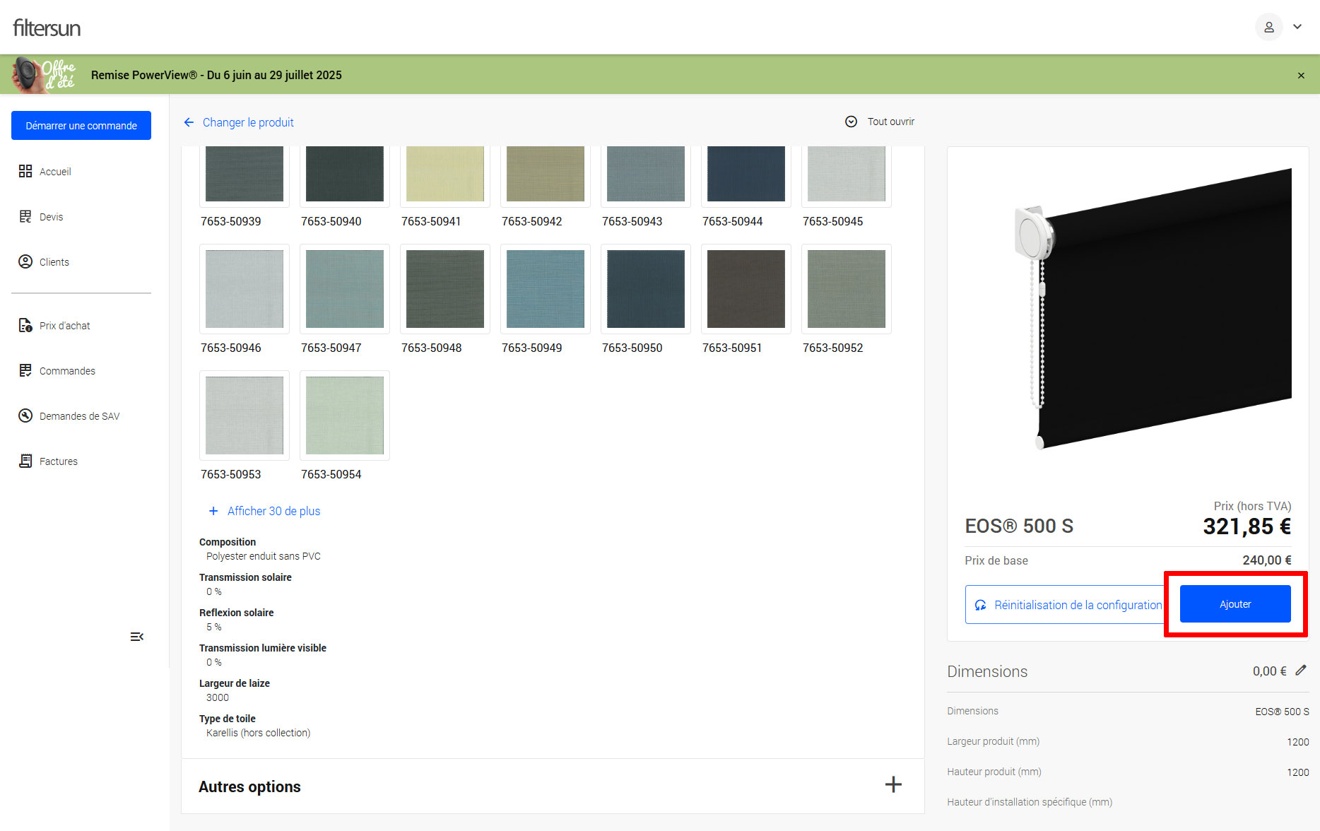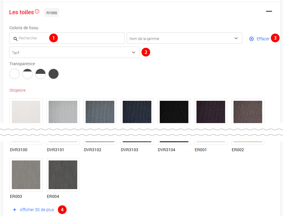 Cette interface vous permet de trouver rapidement votre toile / coloris à l'aide de filtres spécifiques.