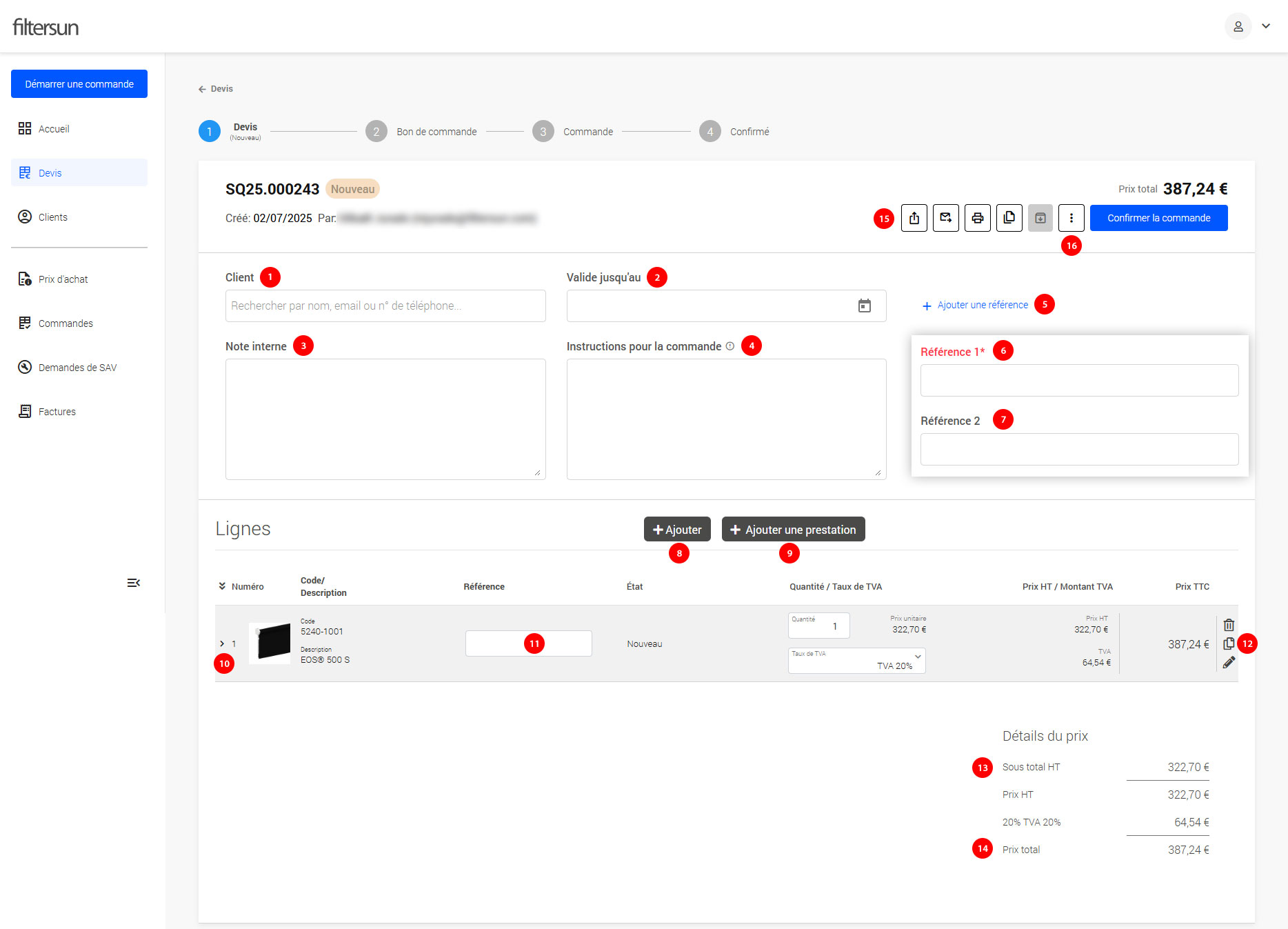 Les devis nécessitent la saisie d'une référence obligatoire dans le champ "Référence 1" (1).
