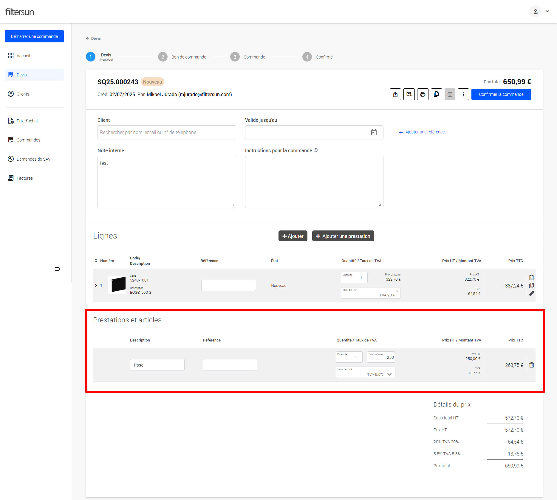 En cliquant sur le bouton "Ajouter une prestation" (9), vous pouvez ajouter des prestations personnalisées à votre devis. Ces prestations sont totalement libres et vous permettent de compléter votre devis selon vos besoins (frais de pose par exemple...). Vous pouvez utiliser le taux de TVA adapté parmi ceux proposés.